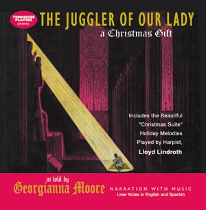 as told by Georgianna Moore December 27, 1992 The Inspiring Christmas story about poor Barnaby, the Juggler, is believed to be about 500 years old. Barnaby juggled six golden balls as his Christmas gift to God. Georgianna read this beautiful story on the Theatre Scene, a weekly radio program produced by Tennessee Players. Brings back memories of the "Golden Age of Radio." Story was first heard on network radio in 1938, read by John Nesbitt on the Gulf Oil program. Liner notes in English and Spanish |